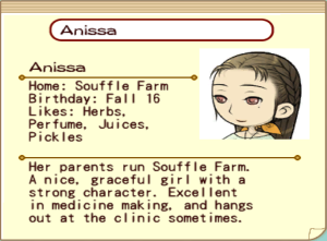 "Her parents run Souffle Farm. A nice, graceful girl with a strong character. Excellent in medicine making, and hangs out at the clinic sometimes." - Anissa's Town Hall Resident Card