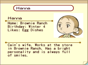 "Cain's wife. Works at the store in Brownie Ranch. Has a bright personality and is always full of smiles." - Hanna's Town Hall Resident Card