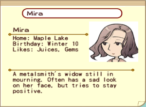 "A metalsmith's widow still in mourning. Often has a sad look on her face, but tries to stay positive." - Mira's Town Hall Resident Card