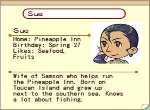 "Wife of Samson who helps run the Pineapple Inn. Born on Toucan Island and grew up next to the southern sea. Knows a lot about fishing." - Sue's Town Hall Resident Card